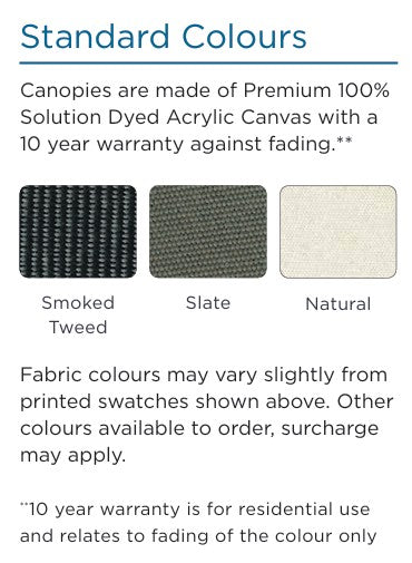 Completed with a 100% solution-dyed acrylic canvas by Recasens, offering exceptional colourfastness and a 10-year fade warranty